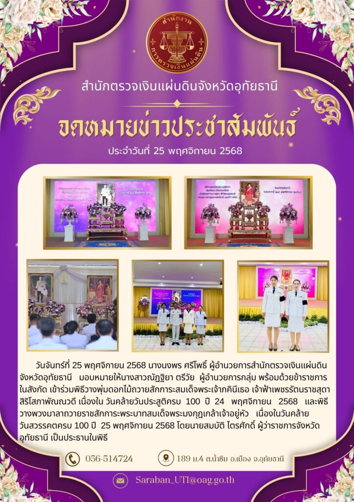 วันจันทร์ที่ 25 พฤศจิกายน 2568 นางนงพร ศรีโพธิ์ ผู้อำนวยการสำนักตรวจเงินแผ่นดินจังหวัดอุทัยธานี มอบหมายให้